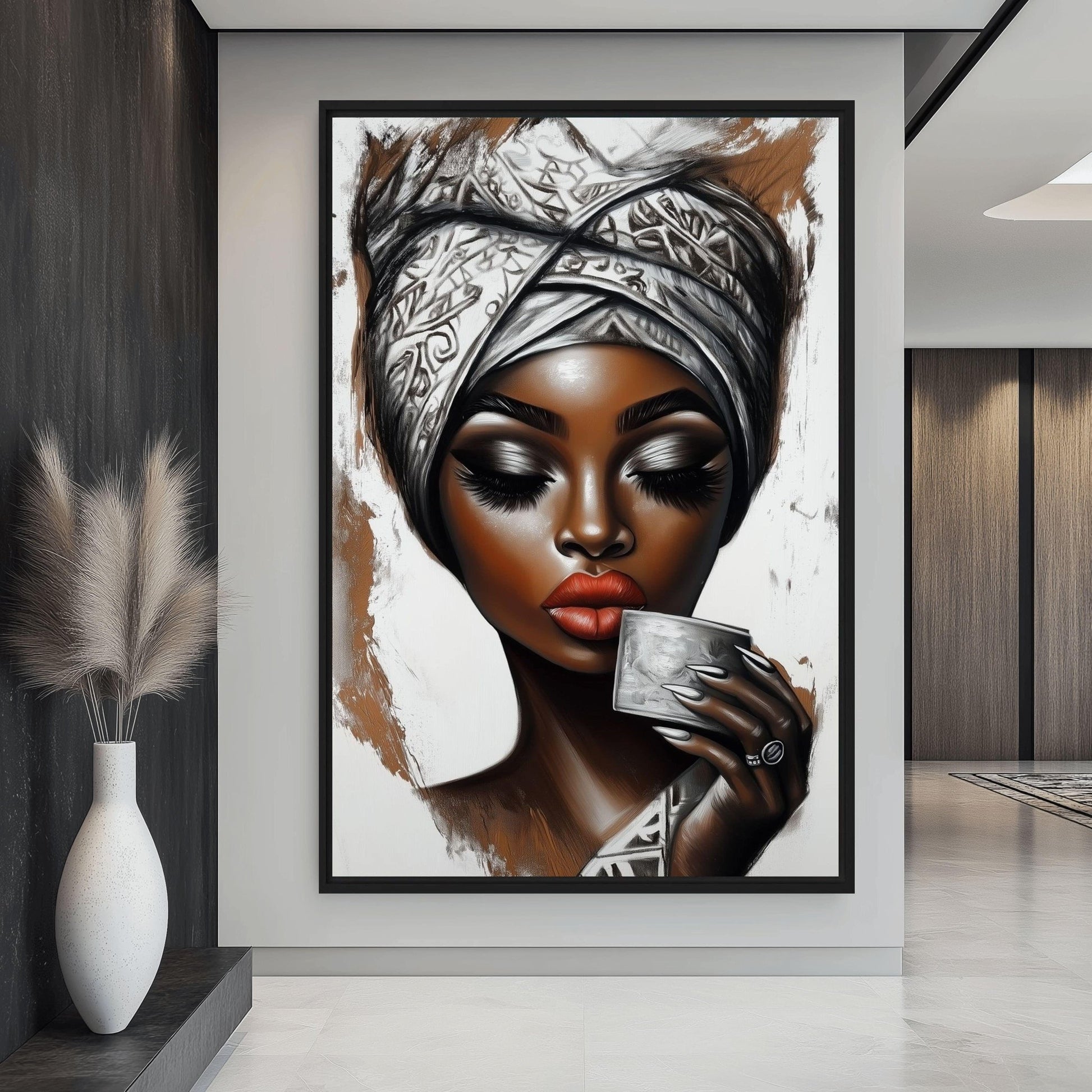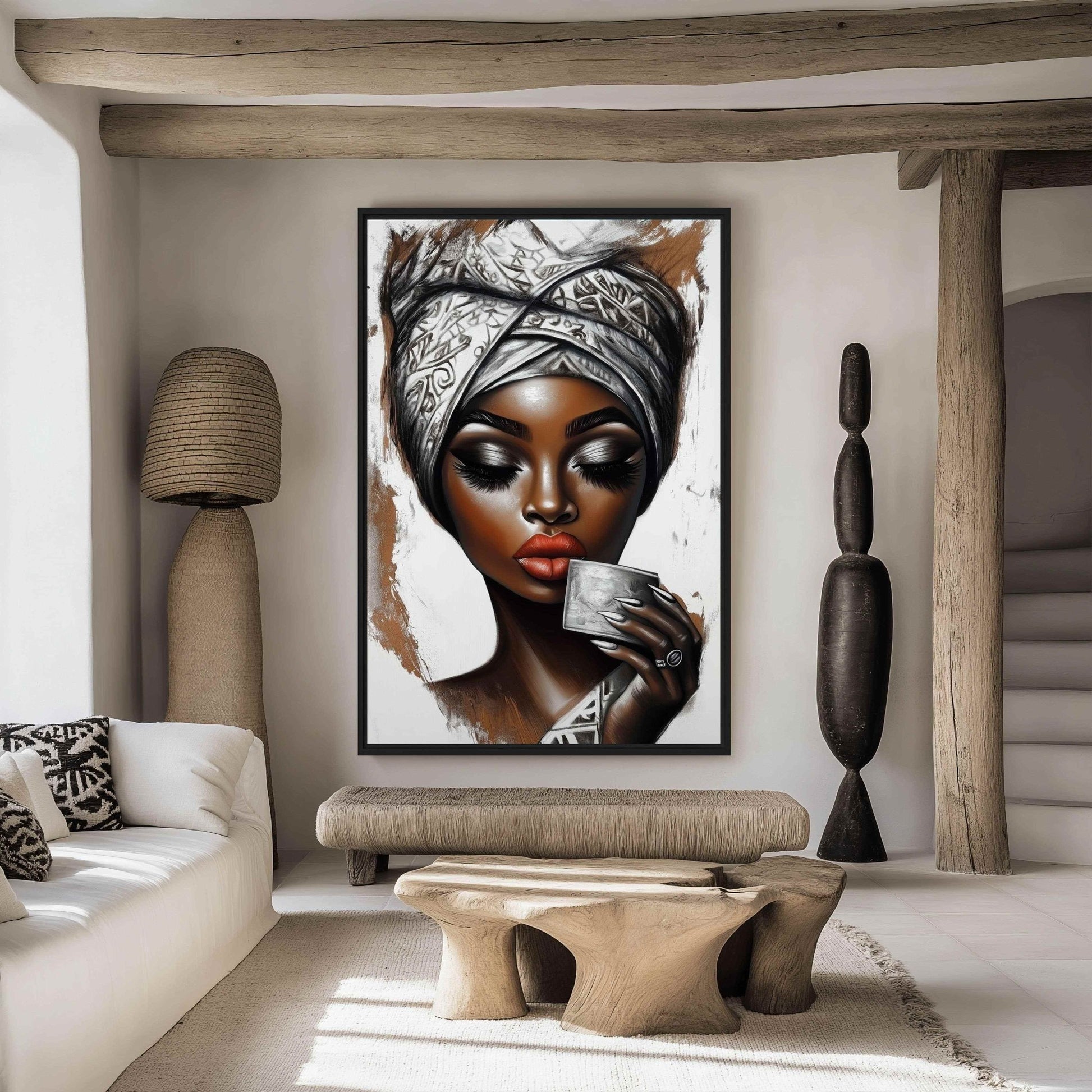 This artwork is inspired by the warmth, culture, and everyday elegance of African life, capturing a serene moment of a woman enjoying coffee. It symbolizes comfort, mindfulness, and the simple joys that bring connection and calm.