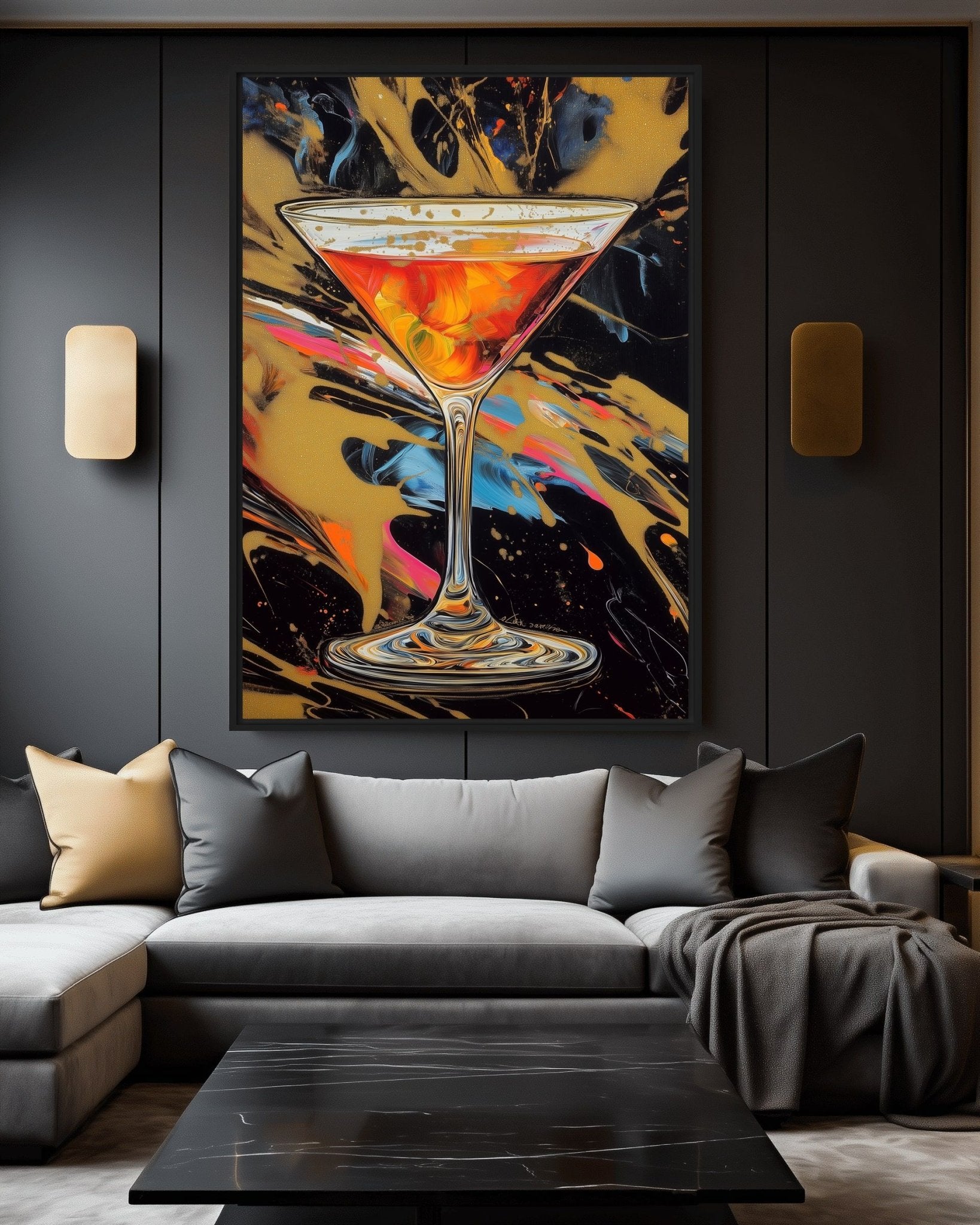 Cocktail Bar Cart Art is a vibrant celebration of sophistication and conviviality, inspired by the timeless allure of a well-curated bar cart. This modern artwork captures the essence of social gatherings, where clinking glasses and shared stories create moments of joy. The dynamic composition, with its bold lines and rich hues, evokes the energy of a lively soirée, blending retro charm with contemporary flair.