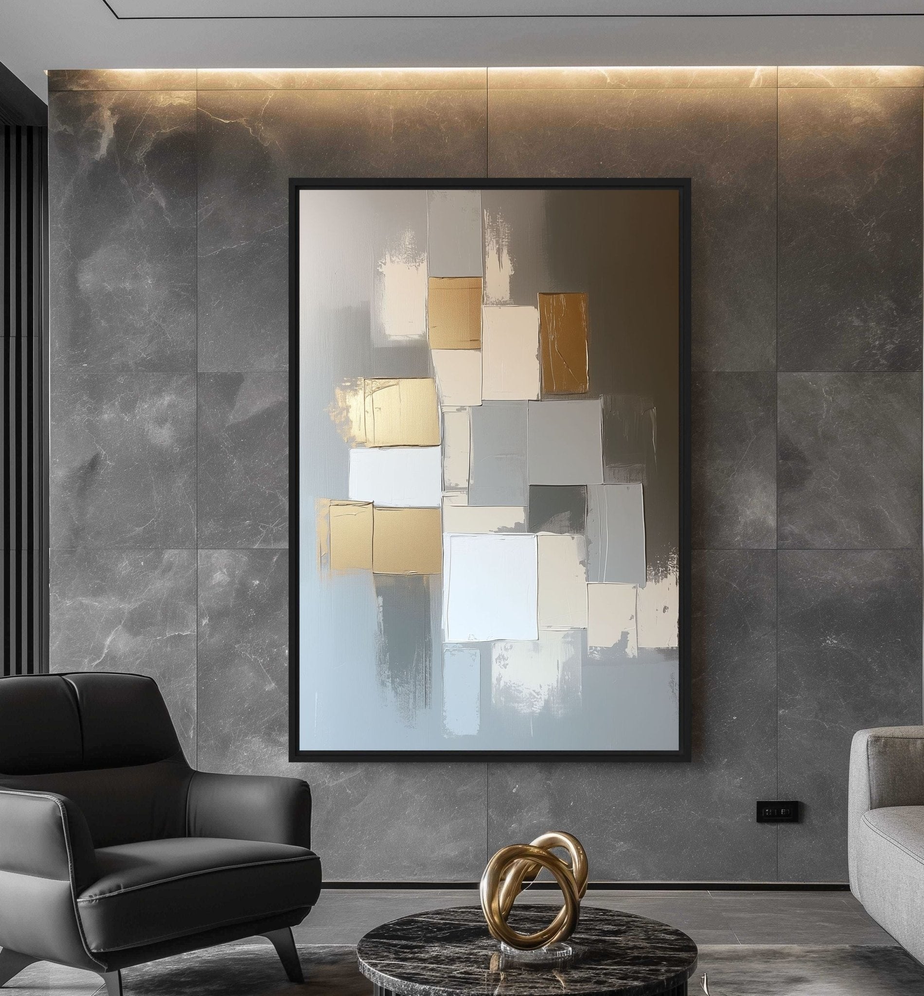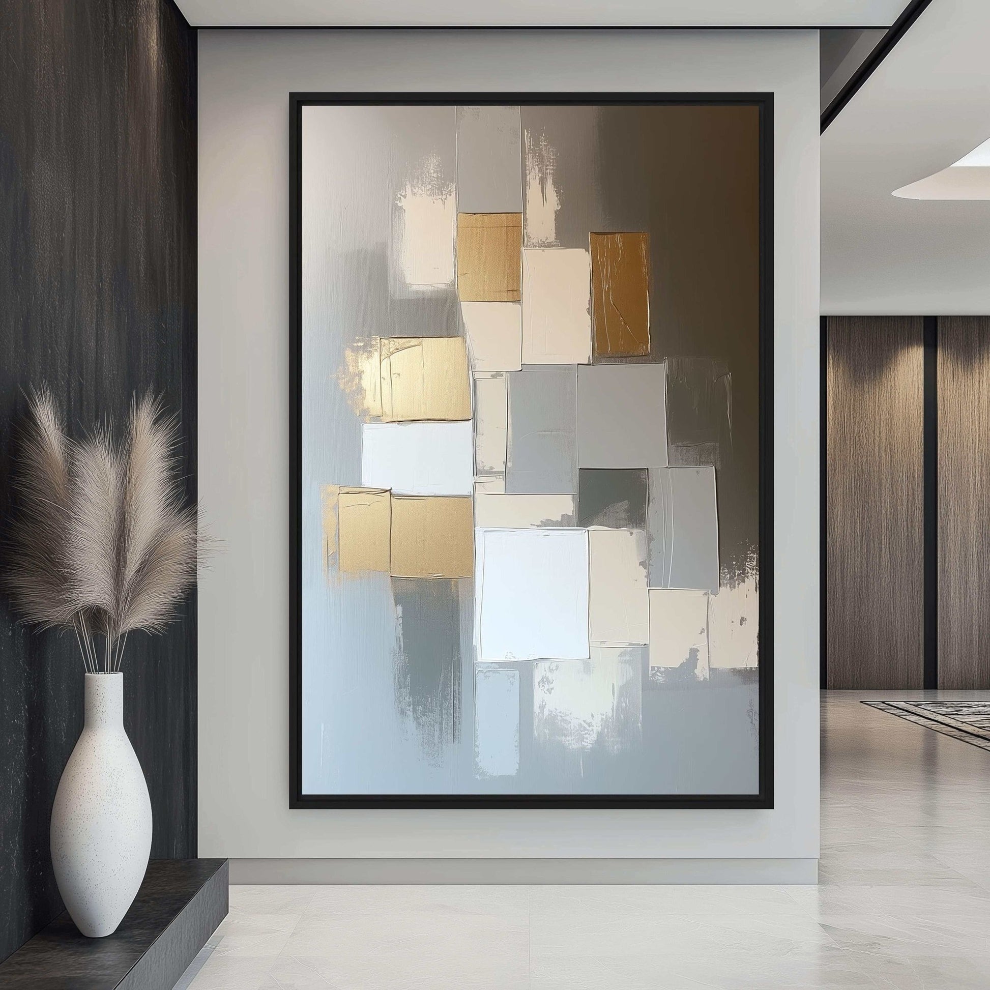 This artwork is inspired by the harmony found in balanced shapes and muted modern color palettes, blending gold, beige, and grey tones to create a sense of calm sophistication. The geometric forms symbolize structure, clarity, and intentional design, reflecting the beauty of order within contemporary spaces.