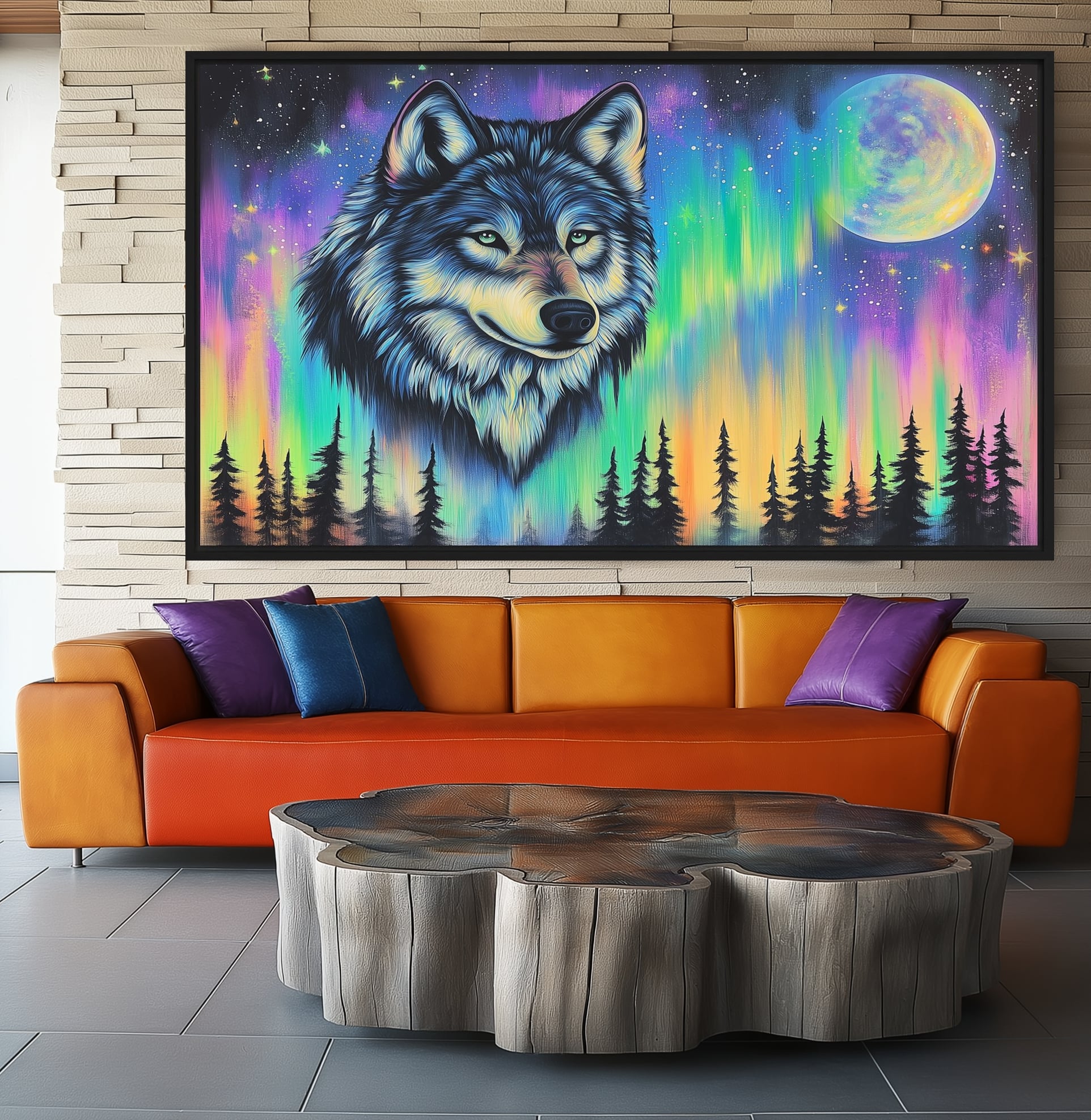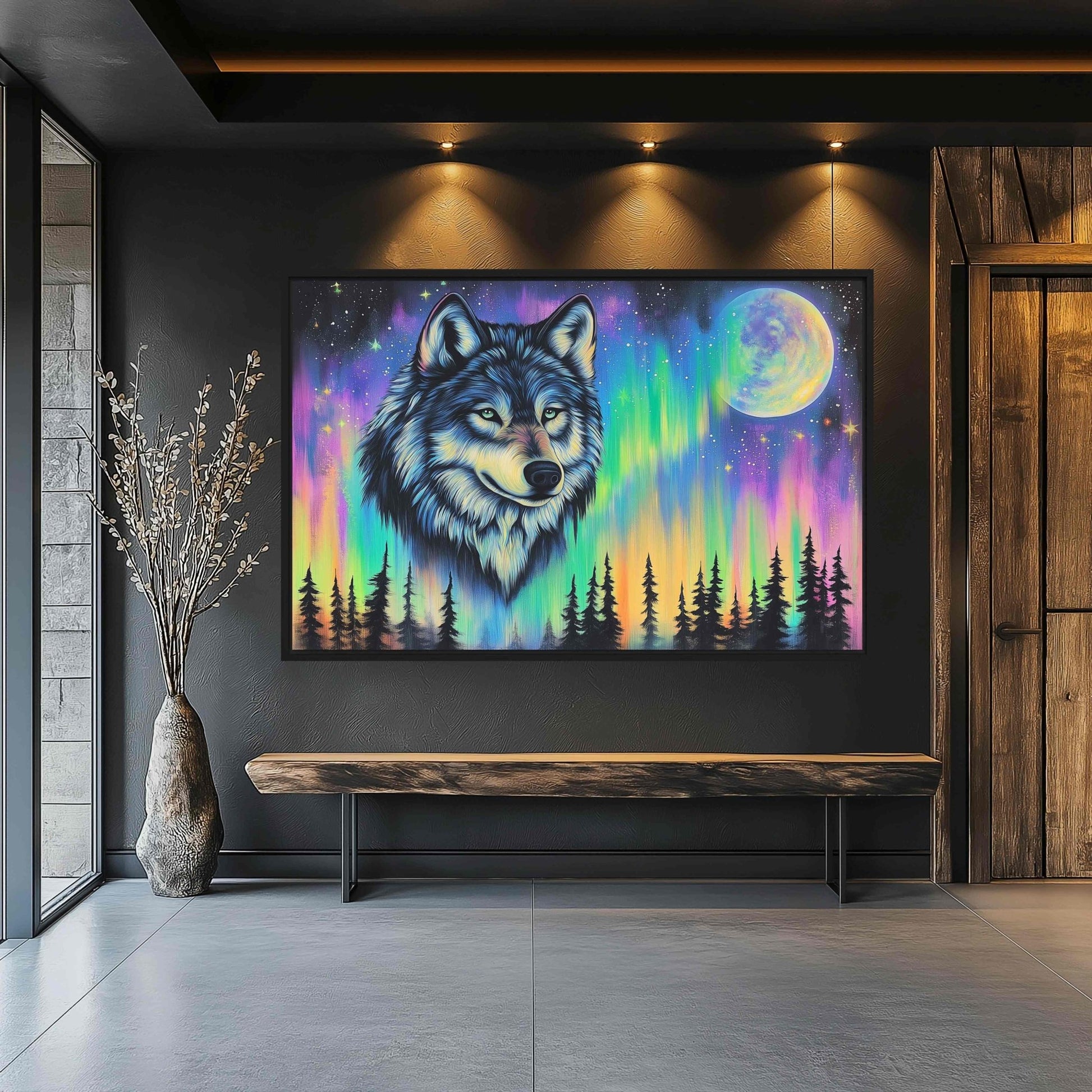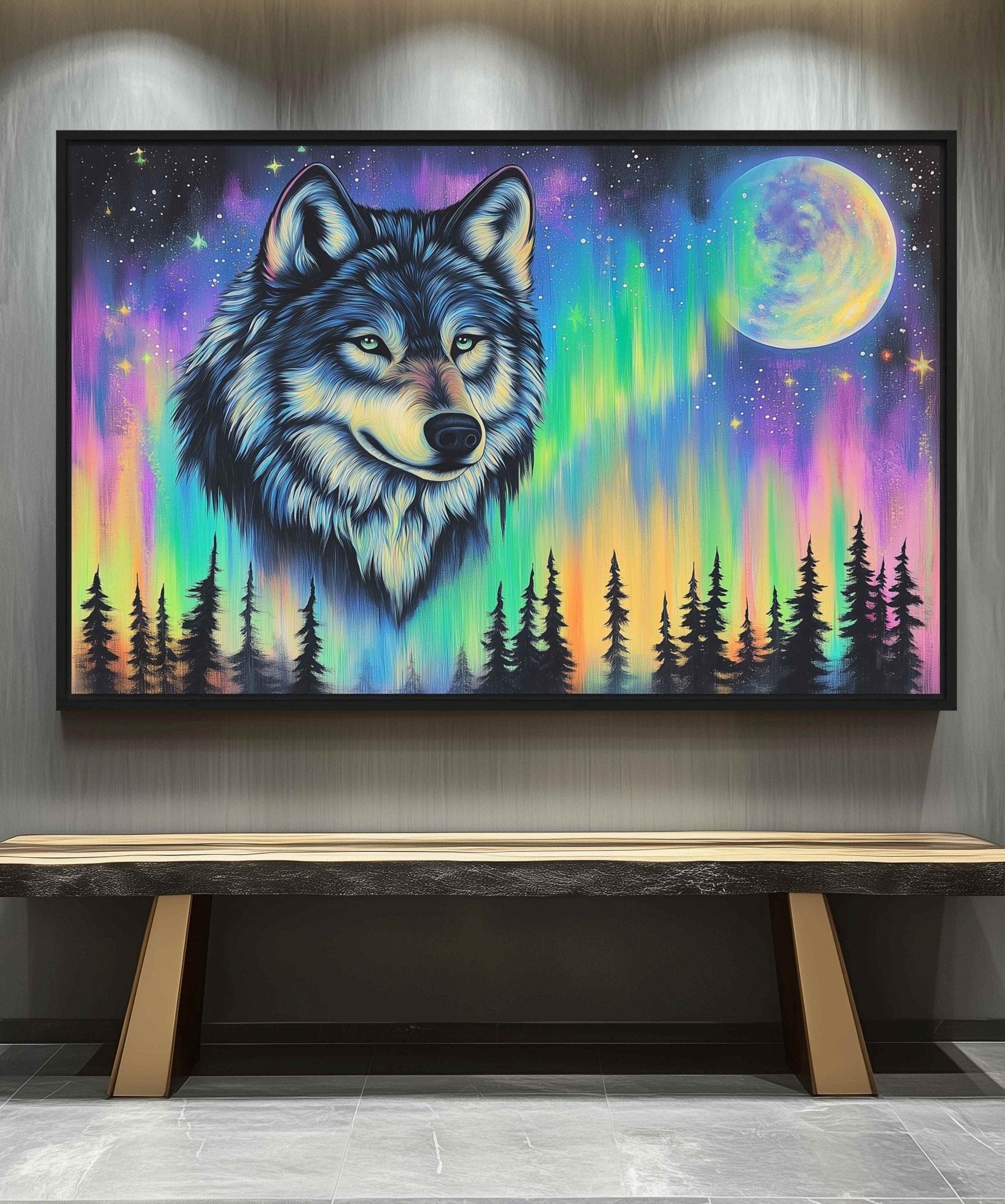 Northern Lights Wolf Wildlife Art Framed Canvas