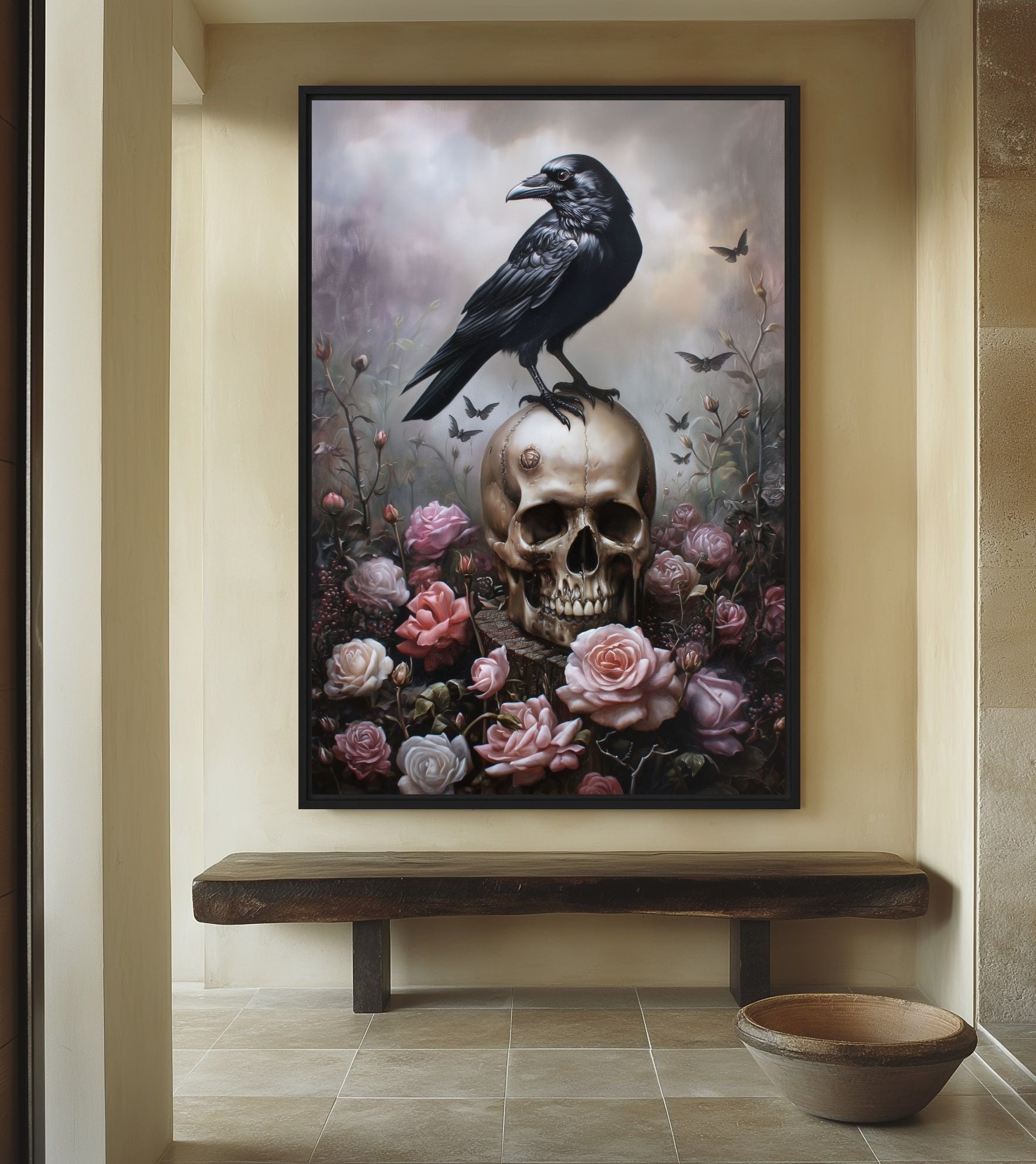Inspired by gothic symbolism and dark romanticism, Raven & Skull Gothic Art explores themes of mystery, transformation, and the passage of time. The raven represents intelligence and the unseen, while the skull symbolizes mortality and reflection, together creating a powerful narrative of life and darkness. This artwork evokes depth, intrigue, and emotional intensity.