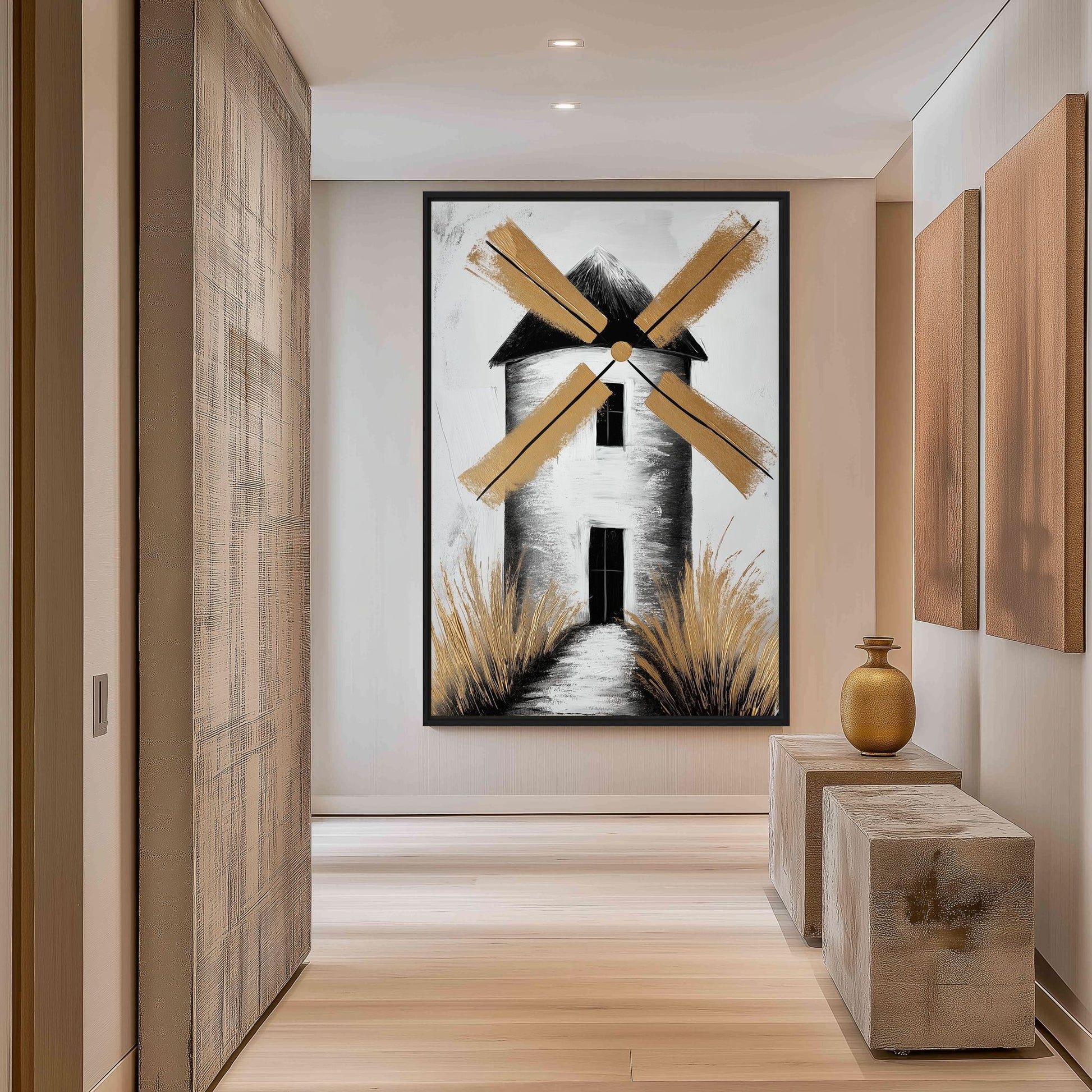 Windmill Landscape Art is inspired by the serene beauty and timeless charm of rural landscapes. The windmill, a symbol of harmony with nature and enduring simplicity, is captured through a modern artistic perspective that emphasizes balance, light, and peaceful movement.