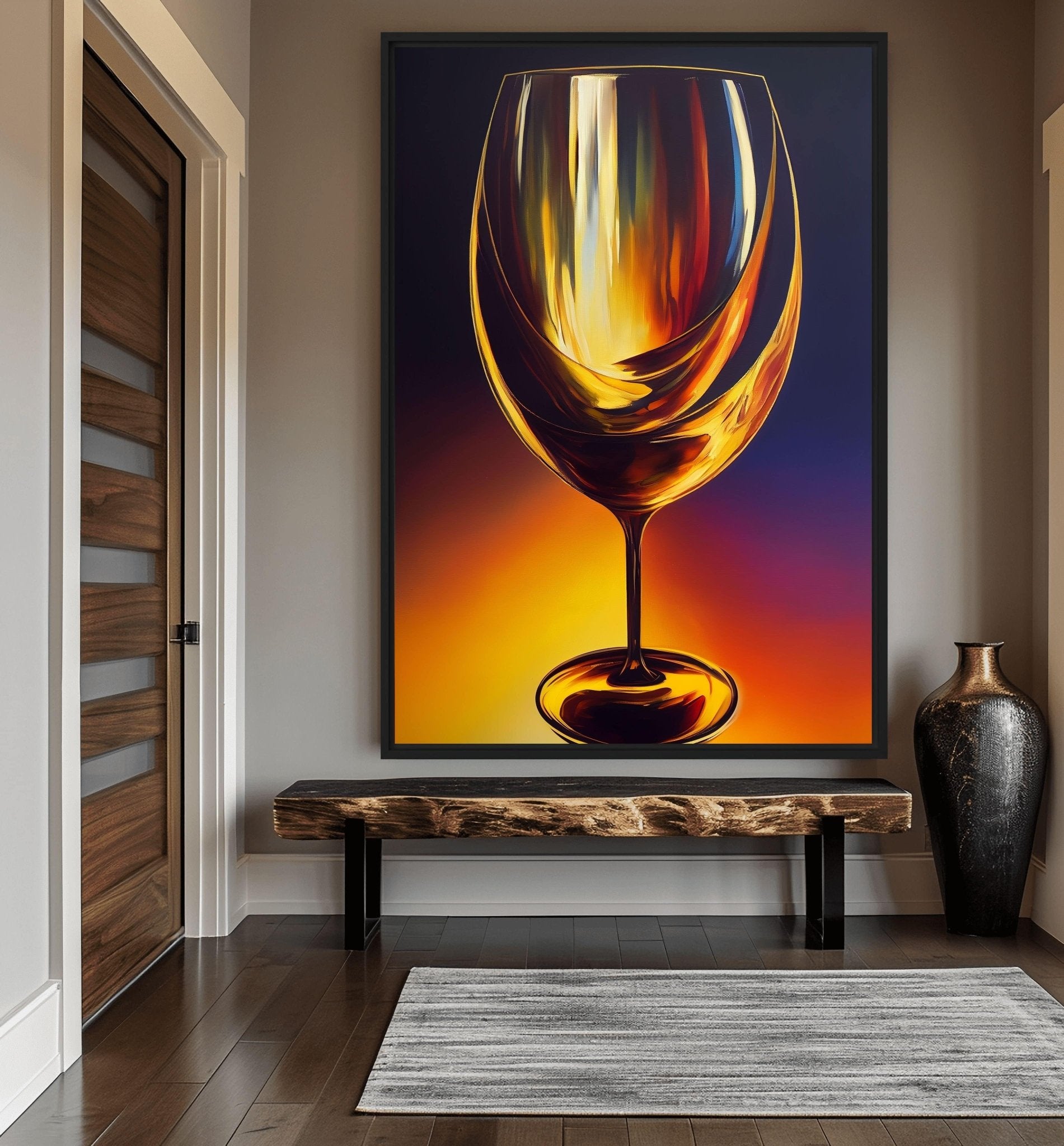 The Wine Glass Abstract Art framed canvas is inspired by the timeless ritual of sharing a glass of wine, symbolizing celebration, intimacy, and reflection. Its abstract design captures the fluidity and elegance of the moment, using expressive forms to convey both energy and serenity.